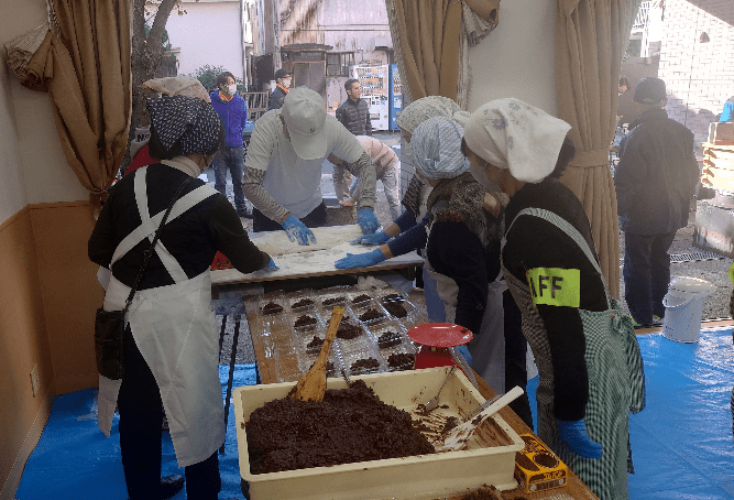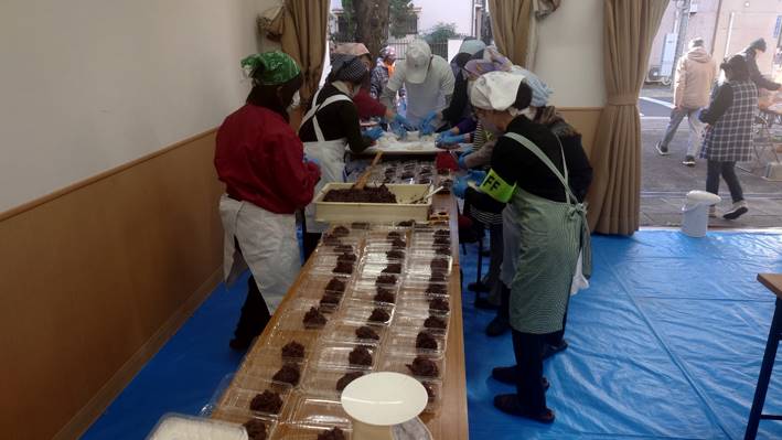 8時過ぎには餅がつきあがり役員、サポーターの方々が11時からの配布に向けて作業始めました。